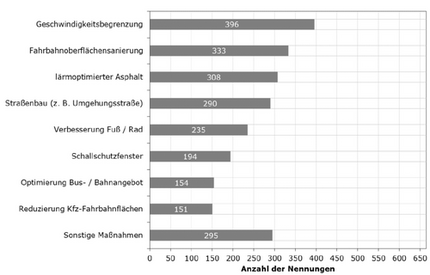 Aus Sicht der Teilnehmenden an der Bürgerbefragung sind Geschwindigkeitsbegrenzungen am geeignetsten, um eine Lärmminderung zu erreichen. Auch die Optimierung der Fahrbahnoberflächen, zusätzliche Umgehungsstraßen sowie eine weitere Verbesserung beim Umweltverbund werden als besonders sinnvolle Lärmminderungselemente angesehen. Zudem unterbreiteten Bürger verschiedene eigene Maßnahmenvorschläge, z.B. für bauliche Schallschutzmaßnahmen, Straßennetzergänzung, Straßenumgestaltung, Verkehrsüberwachung usw.