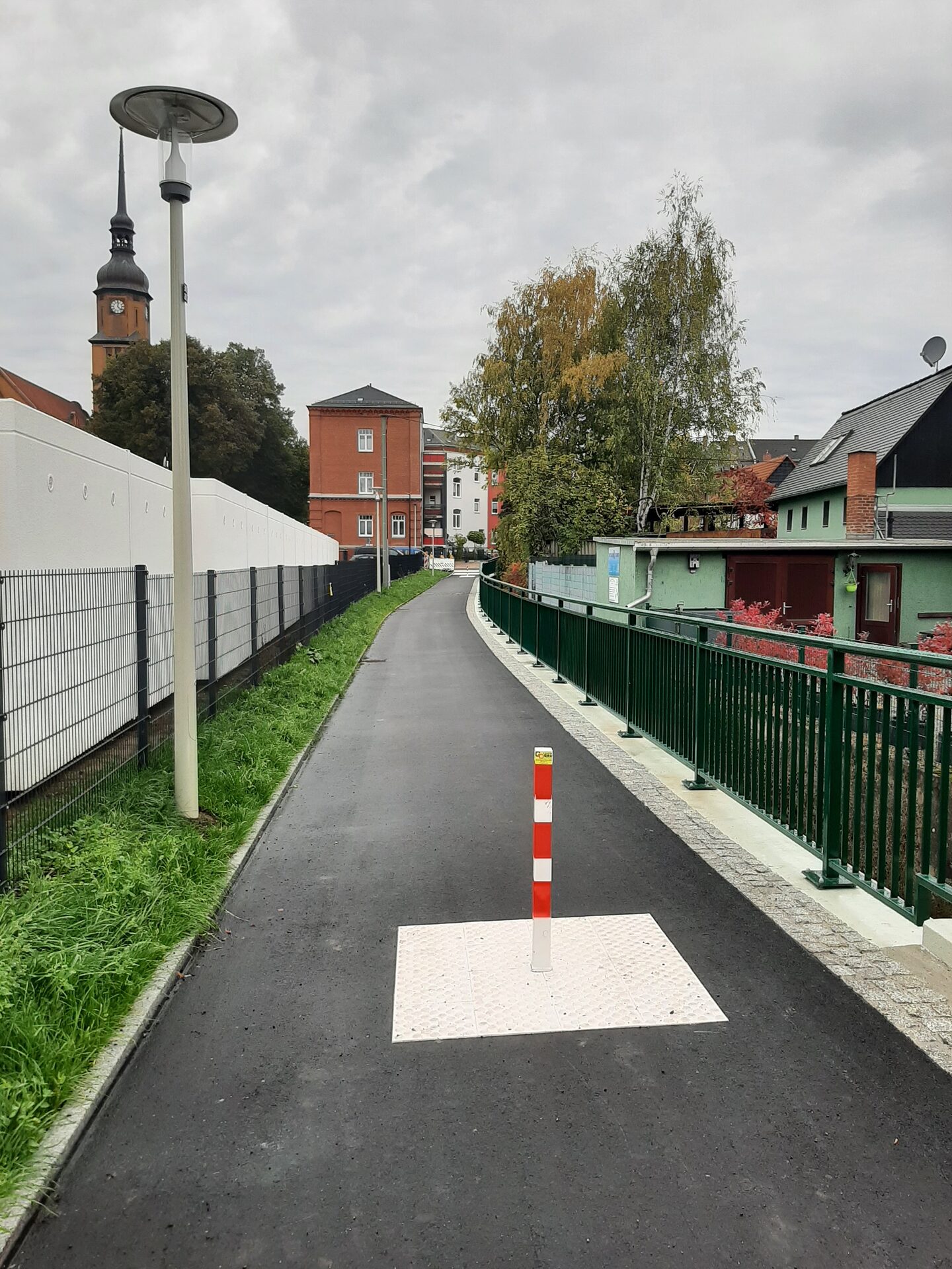 Im Rahmen des Ausbaus eines 130 m langen Teilstücks des Marienthaler Geh- und Radweges erfolgte der Rückbau des zum Teil mit Asphalt befestigten Gehweges und des alten Geländers. Auf drei Meter Breite wurde dann der neue gemeinsame Geh- und Radweg ausgebaut und in Asphaltbauweise befestigt. Bestandteil der Maßnahme war auch die Errichtung einer Straßenbeleuchtung und die Herstellung einer neuen Absturzsicherung auf der Stützwand zum Marienthaler Bach.