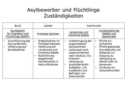 Die Verteilung auf die Bundesländer erfolgt dann entsprechend des „Königsteiner Schlüssels“. Dieser wird jedes Jahr aufgrund der Bevölkerungszahl und der Steuereinahmen festgelegt. Rund 5,1 % aller Asylsuchenden kommen dementsprechend in den Freistaat Sachsen.