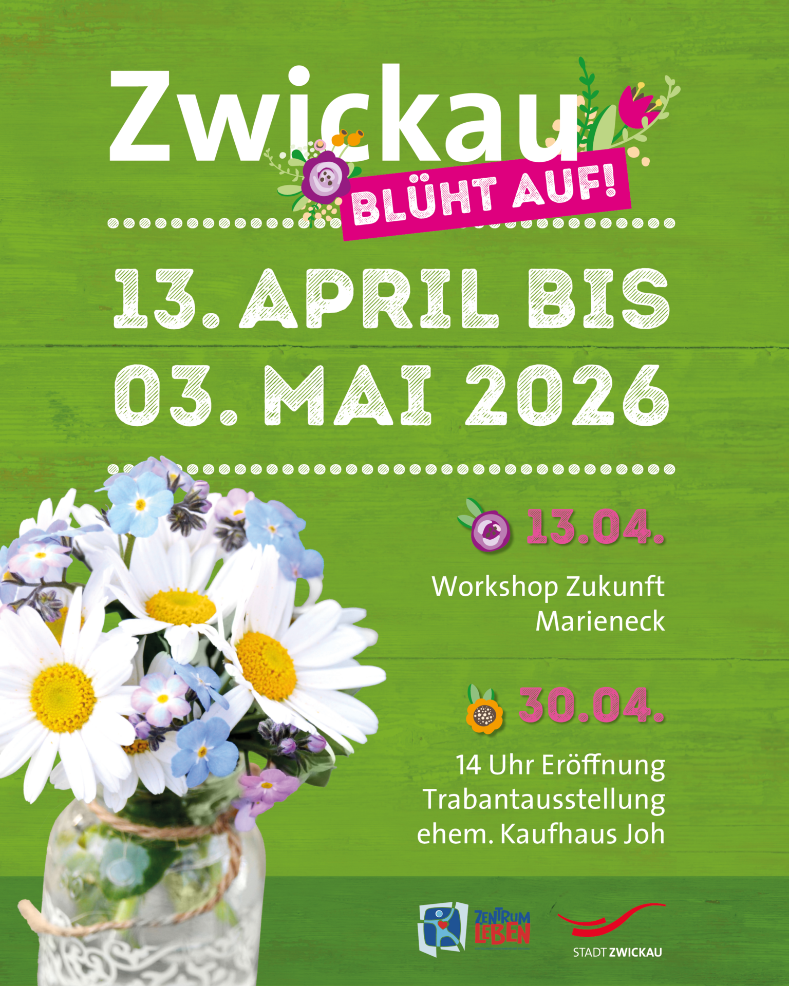 Mit kreativen und originellen Blumenbeeten und Bepflanzungen lädt die Innenstadt ab 13.4.2026 wieder zum Stadtbummel in besonders frühlingshafter Kulisse ein. Unternehmen aus der gesamten Stadt und insbesondere in der Innenstadt ansässige Geschäfte, Gastronomen und weitere Akteure sind herzlich aufgerufen, sich mit einem „Blumen- oder Beetsponsoring“ an der Aktion zu beteiligen und zur Verschönerung und Belebung Zwickaus beizutragen.