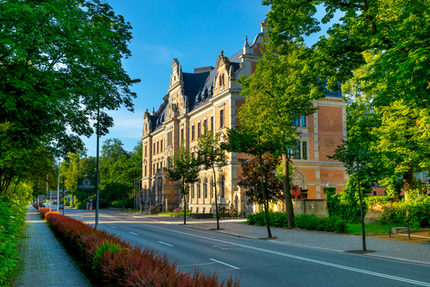 Den stattlichen gelben Ziegelrohbau prägen zahlreiche plastische Zierelemente und Gliederungen in Sandstein. Im Mittelrisalit liegt der repräsentative Haupteingang mit geschwungener Freitreppe und Rundbogenportal. Die repräsentativsten Bereiche im Inneren des Gebäudes bilden das bauzeitliche Foyer mit den anschließenden Fluren und Treppenhäusern.