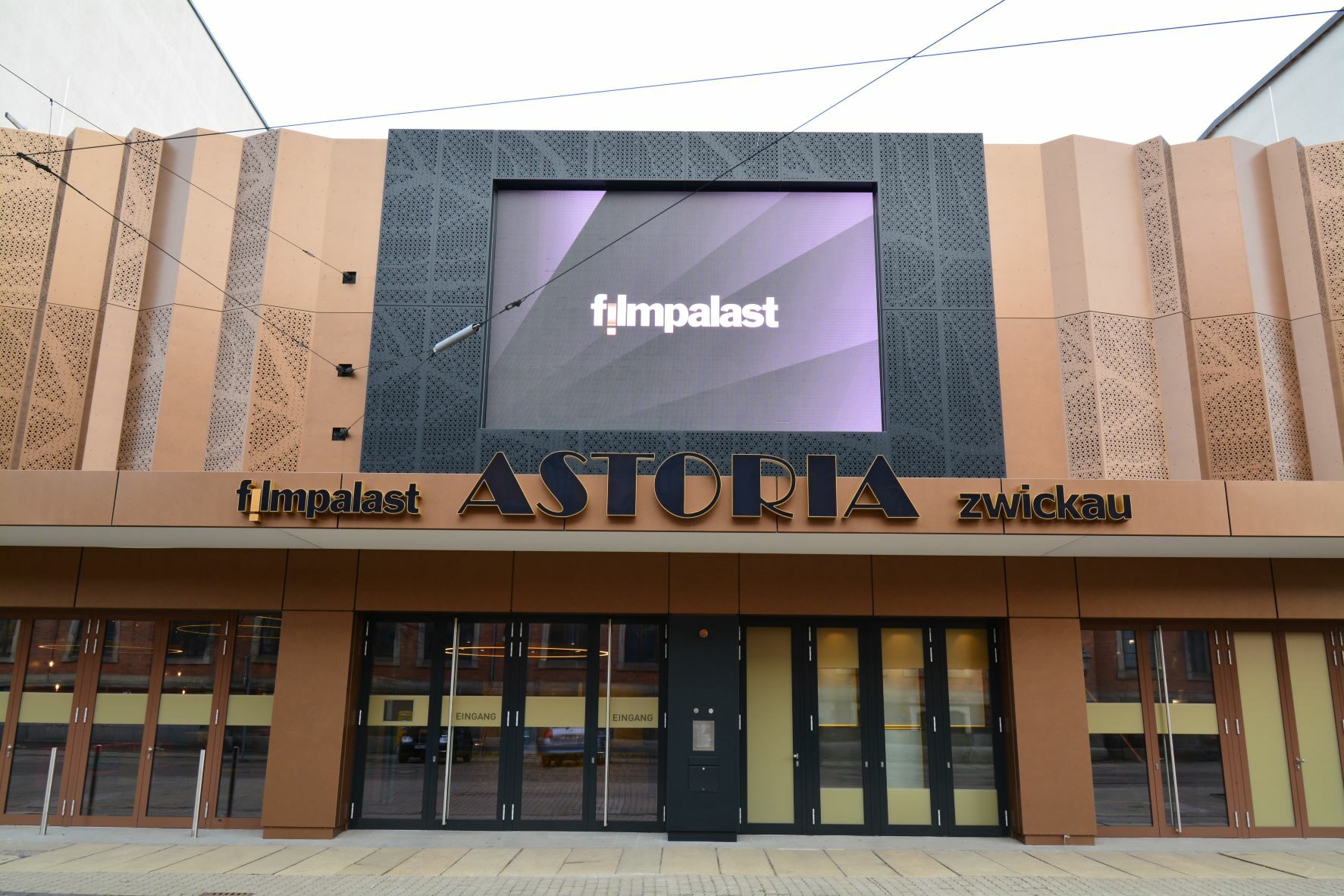 Der filmpalast ASTORIA Zwickau liegt zentral gelegen am Eingang der städtischen Einkaufsmeile und gehört zu einer festen Größe im Stadtbild. Das aufwendig sanierte architektonische Kleinod bietet auf insgesamt elf Leinwänden und 822 hochwertigen Kinosesseln Filme aller Genres. Die klimatisierten Kinosäle, die auch individuell angemietet werden können, überzeugen durch exklusiven Sitzkomfort und garantieren durch neueste technische Ausstattung in Bild und Ton ein unvergessliches Kinoerlebnis. Das offene und großzügig gestaltete Foyer lädt durch seine warme und helle Farbgebung sowie seiner Wohlfühl-Atmosphäre vor oder nach dem Film zu verweilen im „schönten Wohnzimmer Sachsens“ ein.
