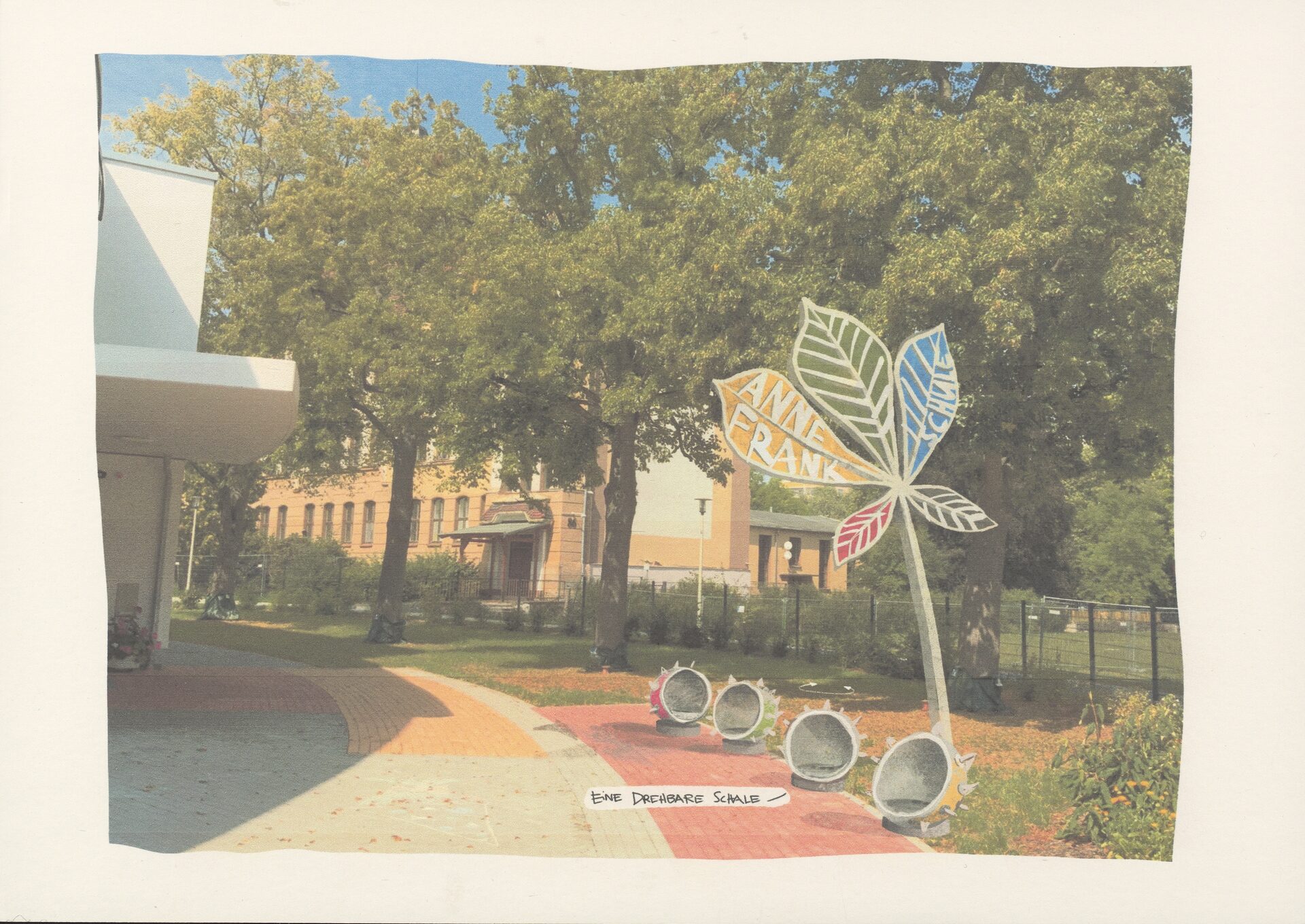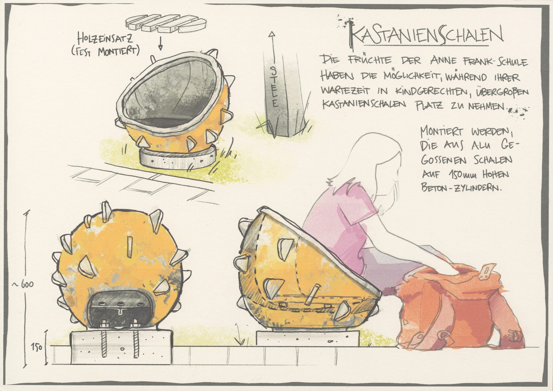 Mithilfe eines großen Blattes, versehen mit der lnschrift „Anne-Frank-Schule“ wird von weitem erkennbar sein, um welches Gebäude es sich handelt. Die Rückseite wird mit handschriftlichen Auszügen aus dem Tagebuch graviert. Direkt unterhalb der Namenstele werden Sitzmöglichkeiten in optischer Anlehnung an die Kastanienschale platziert. ln diesem Bereich halten sich die Kinder vor deren Abholung auf, wodurch der Standort für eine kurze Rast gerade treffend ist.