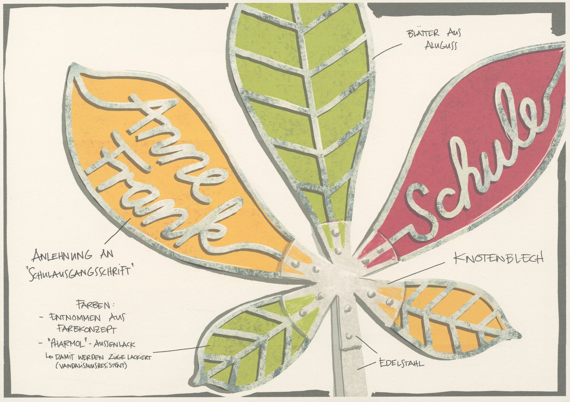 Der Entwurf ist zweiteilig. Er besteht aus einer Stele in Form eines Kastanienblattes (Metall) – auf einer Blattrispe steht der Name der Einrichtung – und vier teilweise drehbaren Sitzschalen in Form von Kastanienschalen in verschiedenen Farben (Metall/Holz). Die Farben finden sich sowohl im Blatt als auch im Gebäude selbst wieder. Auf der Rückseite des Blattes sind Auszüge aus Anne Franks Tagebuch eingraviert.