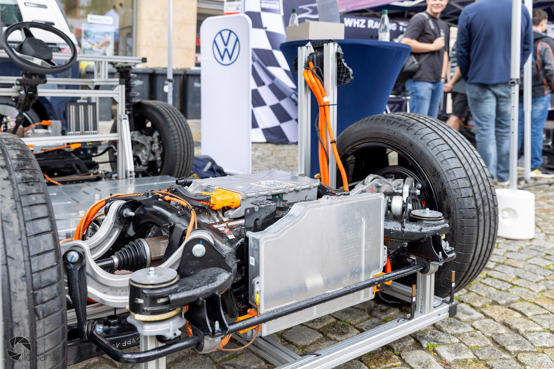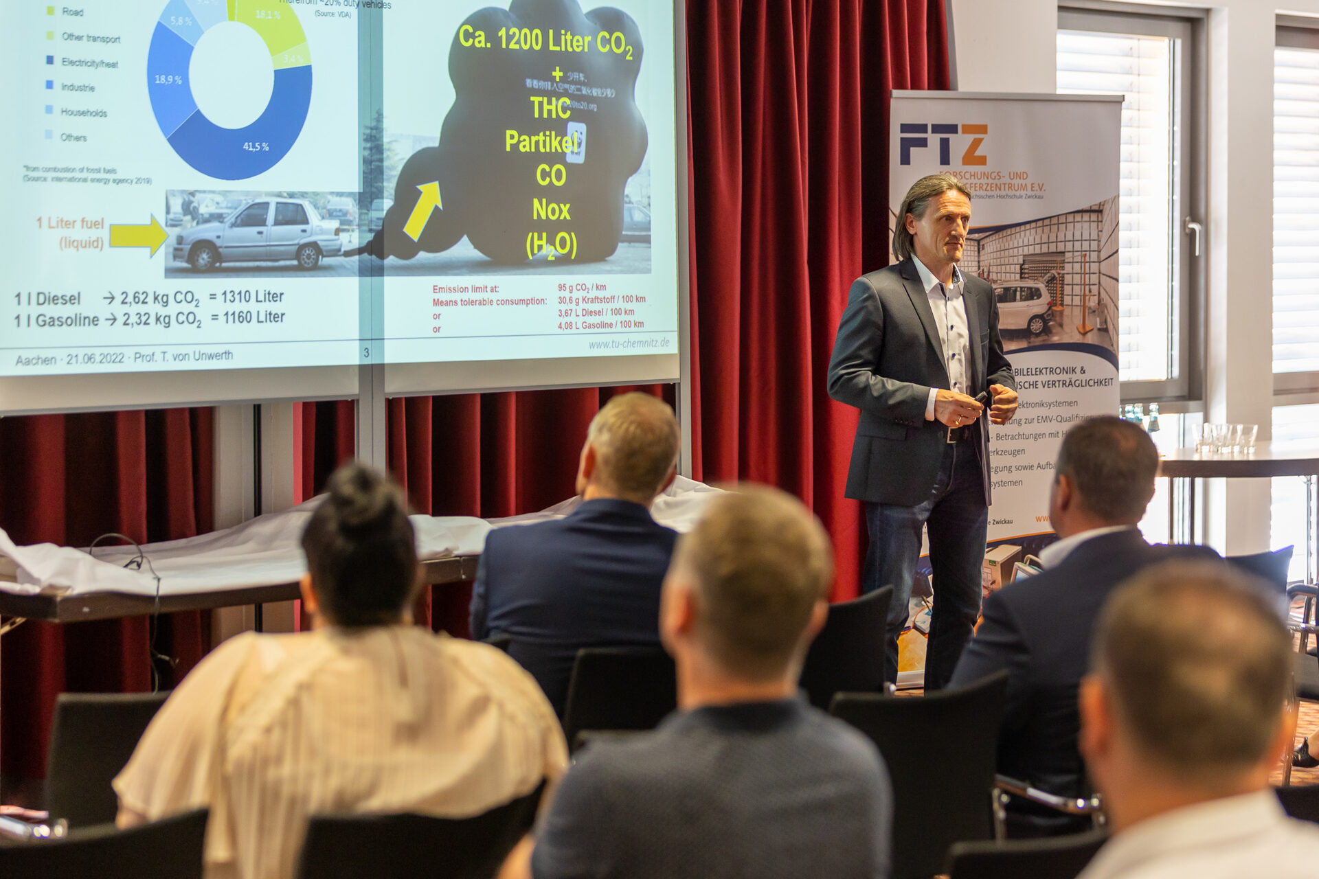 Ab 14 Uhr berichteten vier erfolgreiche WHZ-Absolventen vor rund 160 Besuchern im First Inn Hotel und gaben Einblicke in aktuelle Entwicklungsarbeiten und Herausforderungen. Der WHZ-Elektrotechnik-Absolvent und derzeitiger Vizepräsident Elektrik/Elektronik bei BMW, Dr. Fathi El-Dwaik, gab Einblicke in die zukünftige E/E-Architektur bei BMW. Prof. Dr. Cornel Stan, ehemaliger Vorstandsvorsitzender des FTZ, sprach über die klimagerechte Automobilität der Zukunft. Felix Jacob, Absolvent im Bereich Kraftfahrzeugelektronik und heute Section Manager bei der Volkswagen Group Japan, berichtete aus erster Hand über seine berufliche Laufbahn in der nationalen und internationalen Entwicklung und Produktion von Elektrofahrzeugen. Winfried Brieger von der FES Fahrzeug-Entwicklung Sachsen vermittelte dem Publikum die Bedeutung der Wasserstoffsicherheit bei Brennstoffzellenfahrzeugen und stellte die neue Testkabine der FES vor.