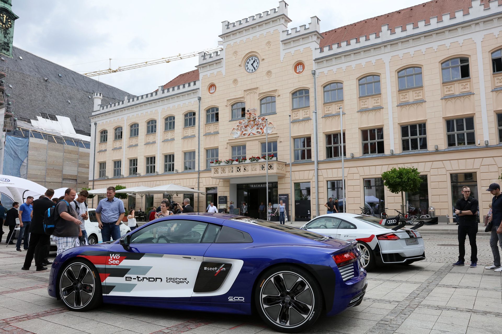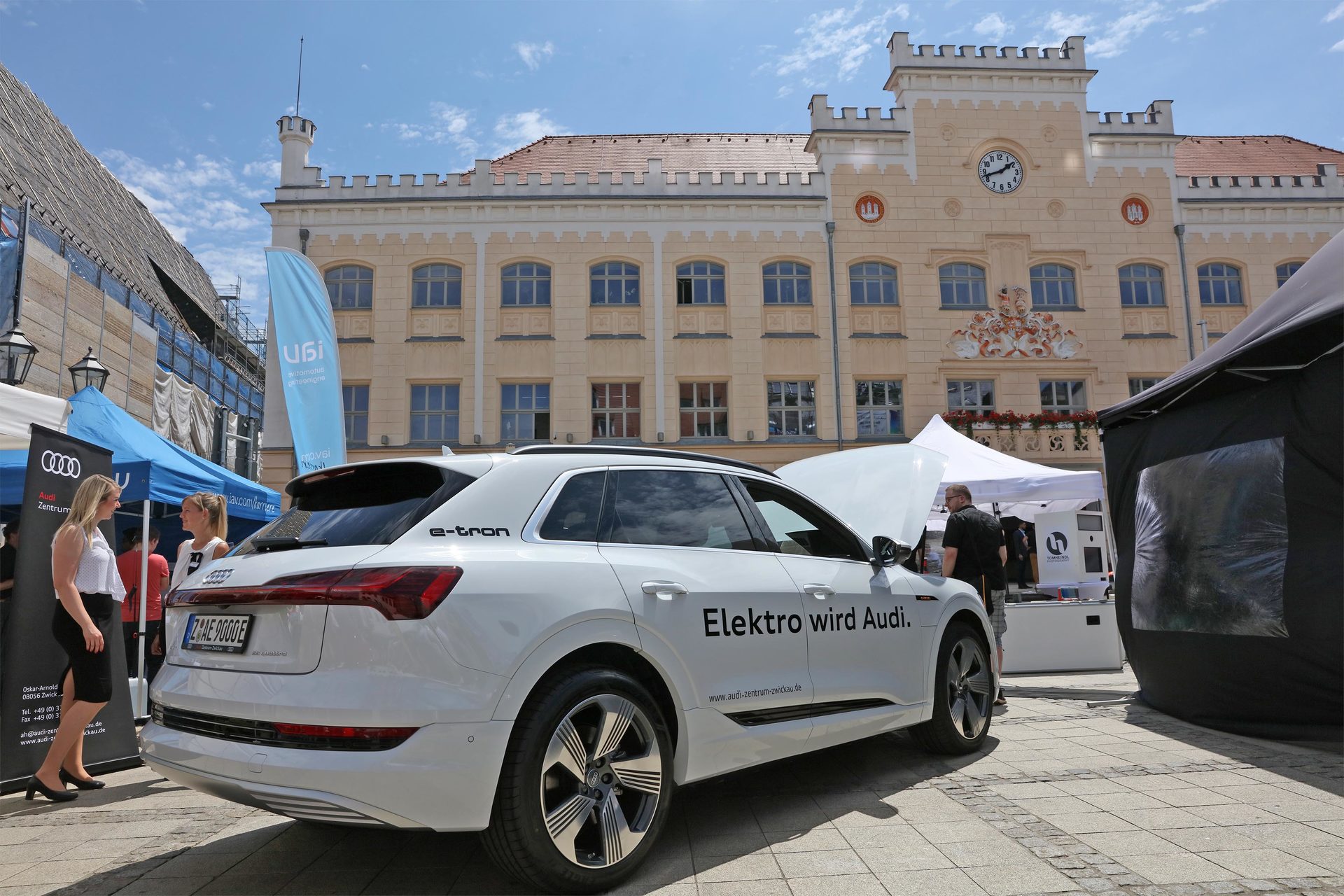 Den Rahmen für intensives Netzwerken bot ab 13 Uhr die Ausstellung auf dem Hauptmarkt und im Zwickauer Rathaus. 18 Unternehmen präsentierten innovative Fahrzeuge, Demonstratoren oder Mobilitätskonzepte und luden auch zum Mitmachen ein. So brachte die FES Fahrzeugentwicklung Sachsen einen mobilen Ladecontainer mit, an dem Besucher und Passanten ihre E-Bikes aufladen konnten. Die Chemnitz Automated Driving Alliance war mit einem Robocar vertreten: An dem Modellfahrzeug ließen sich anschaulich Fragen zum autonomen Fahren erklären. Die Vision der „Smart City“ wurde am Stand der EDAG Group greifbar, die ein Concept Car auf dem Hauptmarkt ausstellten, was durch sein futuristisches Aussehen und die vielfältigen Funktionsweisen viel Aufmerksamkeit bekam. Der Rennwagen des WHZ Racing-Teams und ein Driftfahrzeug der IAMT-Gruppe waren weitere Highlights. Auch die Stadt Zwickau war mit der Ausleihstation für altersgerechte E-Scooter vertreten und informiert außerdem über die vielfältigen Mobilitätsansätze für die Zukunft, die in enger Kooperation mit der Westsächsischen Hochschule Zwickau entwickelt werden.