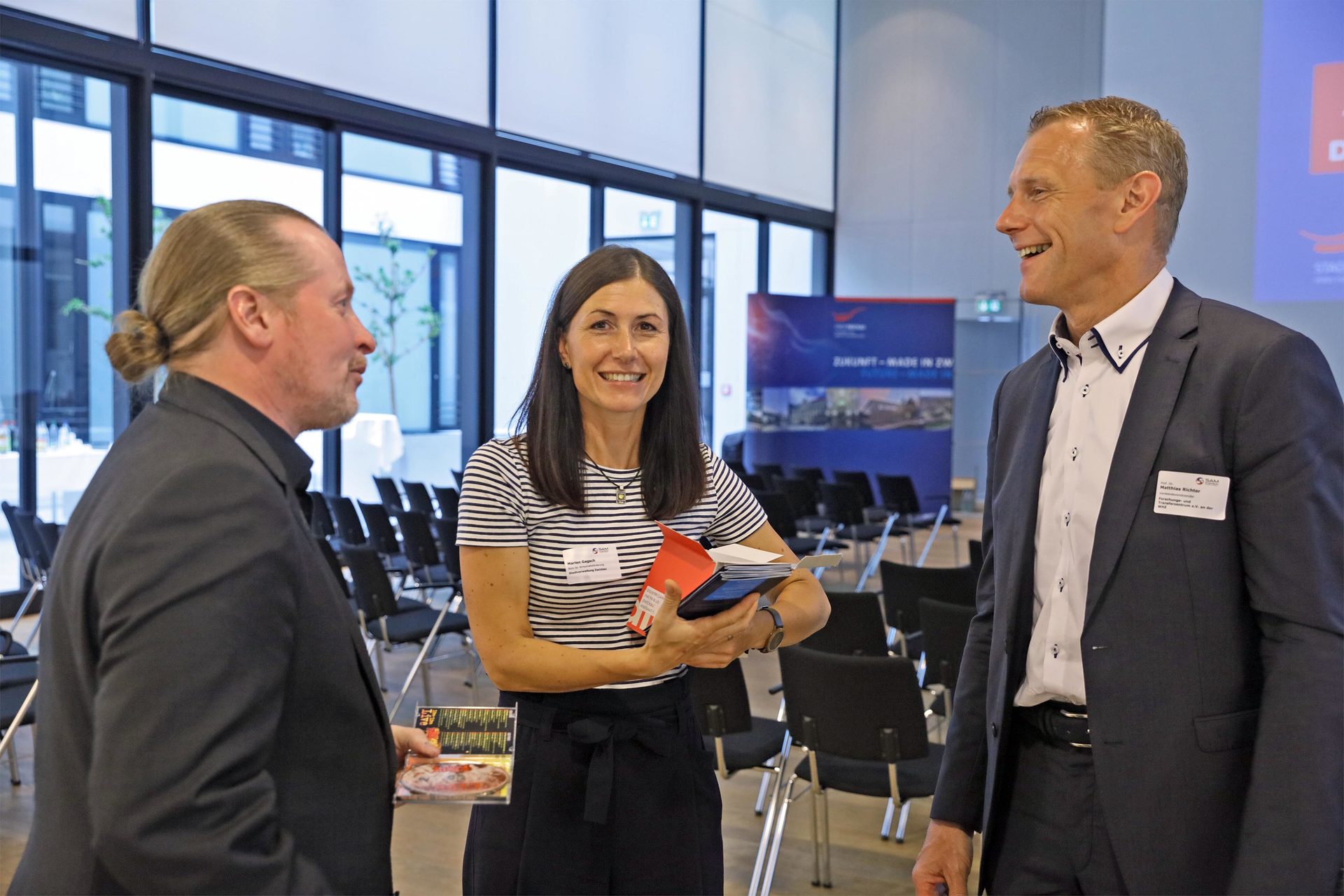 Organisatoren und Keynote-Speaker von SAM 2021: Leiterin der städtischen Wirtschaftsförderung Sandra Hempel, Fußballschiedsrichterin Bibiana Steinhaus-Webb und Vorstandsvorsitzender des FTZ e.V. Prof. Dr.-Ing. Matthias Richter (v.l.n.r.)