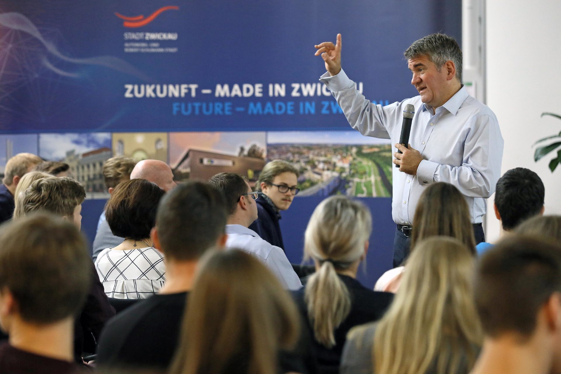 Am darauffolgenden Freitagvormittag gewährte Dr. Dr. Cay von Fournier ‑ ebenso im Bürgersaal des Zwickauer Rathauses, allerdings vor einem Publikum im wesentlich verjüngten Durchschnittsalter ‑ eine „Zugabe“: Er diskutierte mit den Schülerinnen und Schülern aus den 11. Klassen der Zwickauer Gymnasien das Thema „Gestalte Deine Zukunft – Wie Du zum Unternehmer/in Deines Lebens wirst. Sei ein Zukunftsgestalter“. In seinen wiederum sehr pointierten mit unzähligen Praxisbeispielen gepaarten reichlich zweistündigen Ausführungen machte Dr. Dr. Cay von Fournier den ‑ wie er sagte ‑ „möglichen Führungskräften von 2028“ deutlich, dass nicht die schnelle Karriere im Vordergrund der aktiven Lebensgestaltung stehen sollte, sondern dass man Spaß und Freude daran haben soll, sein Leben selbst in die Hand zu nehmen.