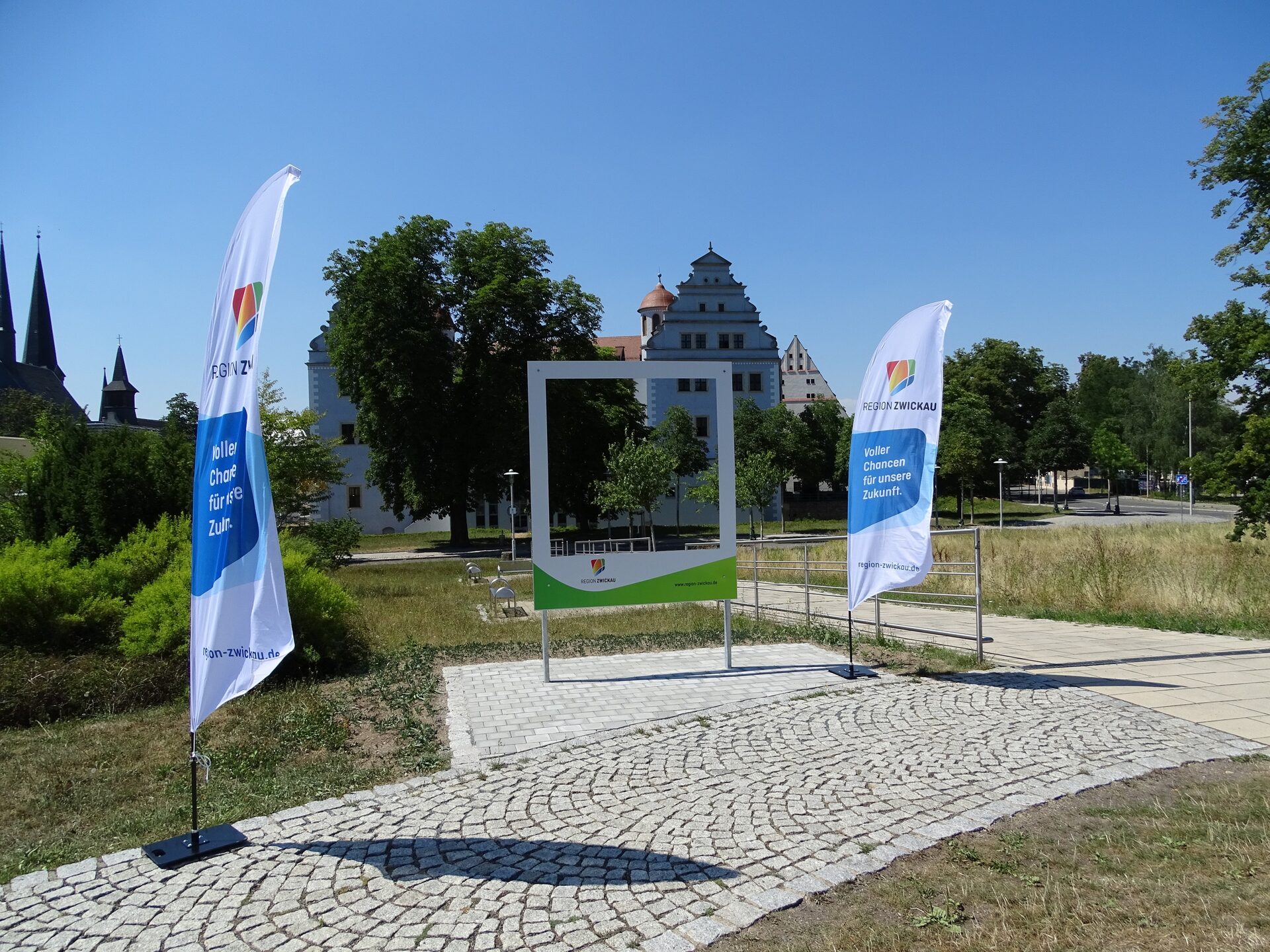 Der erste dieser Bilderrahmen steht im Mulde-Paradies der Stadt Zwickau. Je nach Blickwinkel hat der Betrachter das Schloss Osterstein oder die Türme des Doms in Hintergrund.