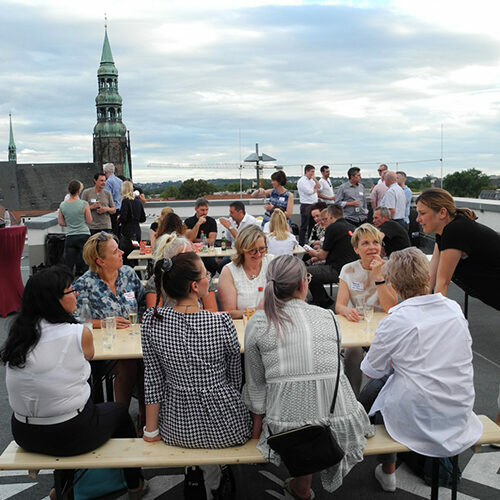 Zum ersten City-Netzwerk-Treff am 13. Juli 2022 hatten der Förderverein Stadtmanagement Zwickau e.V. und das Büro für Wirtschaftsförderung Händler und Gewerbetreibende der Innenstadt eingeladen. Dank der Initiative von Arcaden-Manager Mirko Fröhlich konnte der City-Netzwerk-Treff in cooler Location auf dem Pardeck 5 der Zwickau Arcaden stattfinden. Knapp 40 Teilnehmerinnen und Teilnehmer folgten der Einladung zum lockeren Netzwerken und Austausch über den Dächern der Innenstadt, darunter Oberbürgermeisterin Constance Arndt sowie Sandra Hempel, Leiterin des Büros für Wirtschaftsförderung. Der Förderverein Stadtmanagement stellte Getränke und Schnittchen, das in der Inneren Schneeberger Straße ansässige Geschäft Royal Donuts sponserte kunstvoll verzierte Donuts für den Abend und die Moccabar sorgte mit einem professionellen DJ-Set für groovige Lounge-Musik.