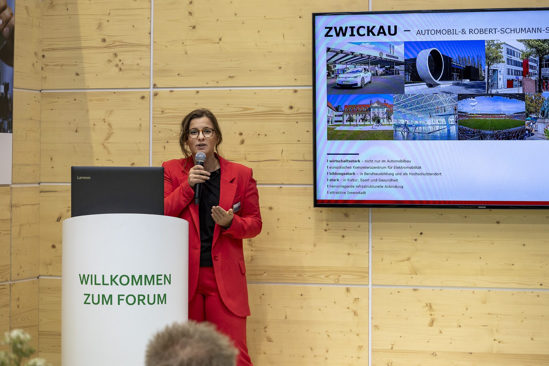 Abgerundet wurde die Präsentation der Stadt Zwickau mit einem Vortrag von Baubürgermeisterin Silvia Queck-Hänel. Dem Leitgedanken am Gemeinschaftsstand entsprechend lautete das Thema des Vortrages „Stadt Zwickau und das Königliche Krankenstift. Ein Best-Practice Beispiel für eine eindrucksvolle Symbiose aus Denkmalschutz und Reaktivierung von Einzelhandel in herausfordernden Zeiten im zentrumsprägenden Quartier“.