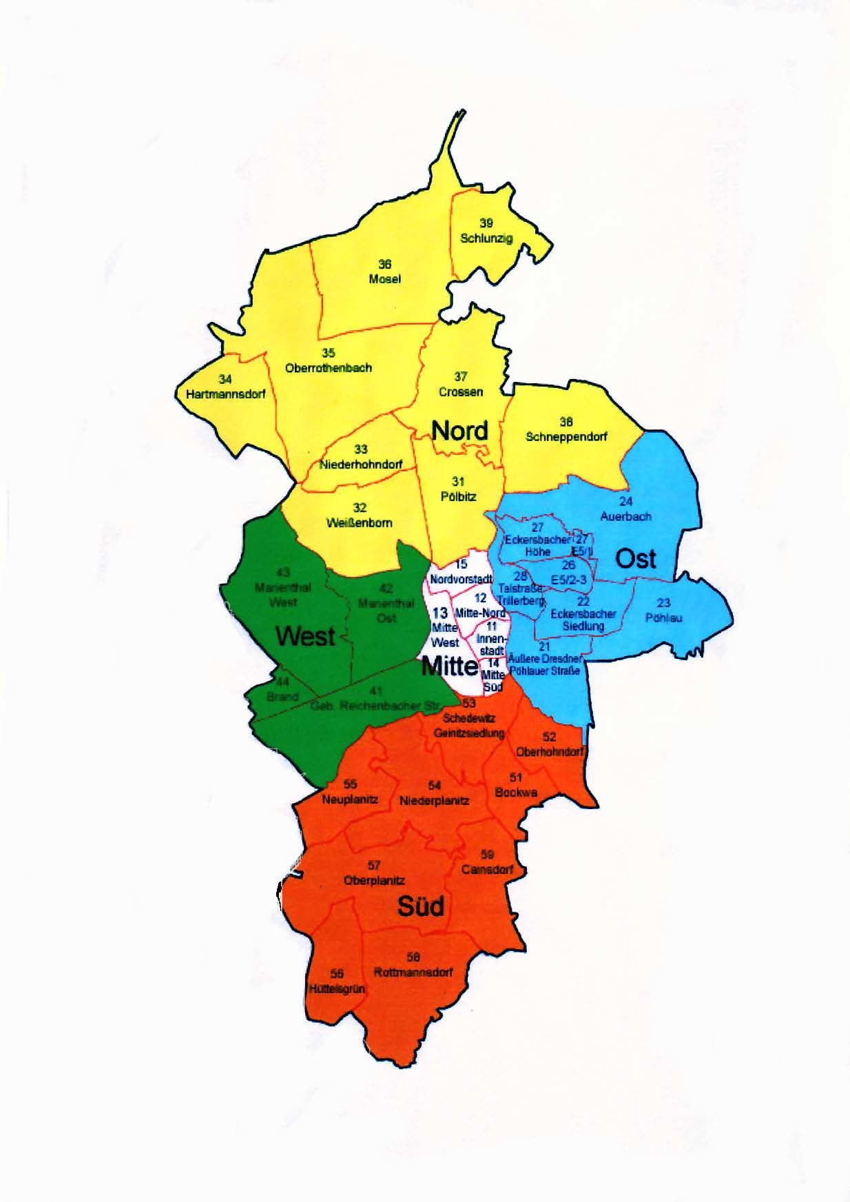 Niederhohndorf, Weißenborn, Marienthal, Niederplanitz, Oberplanitz, Zwickau-Innenstadt, Pölbitz, Eckersbach, Auerbach, Pöhlau, Schedewitz, Oberhohndorf, Bockwa