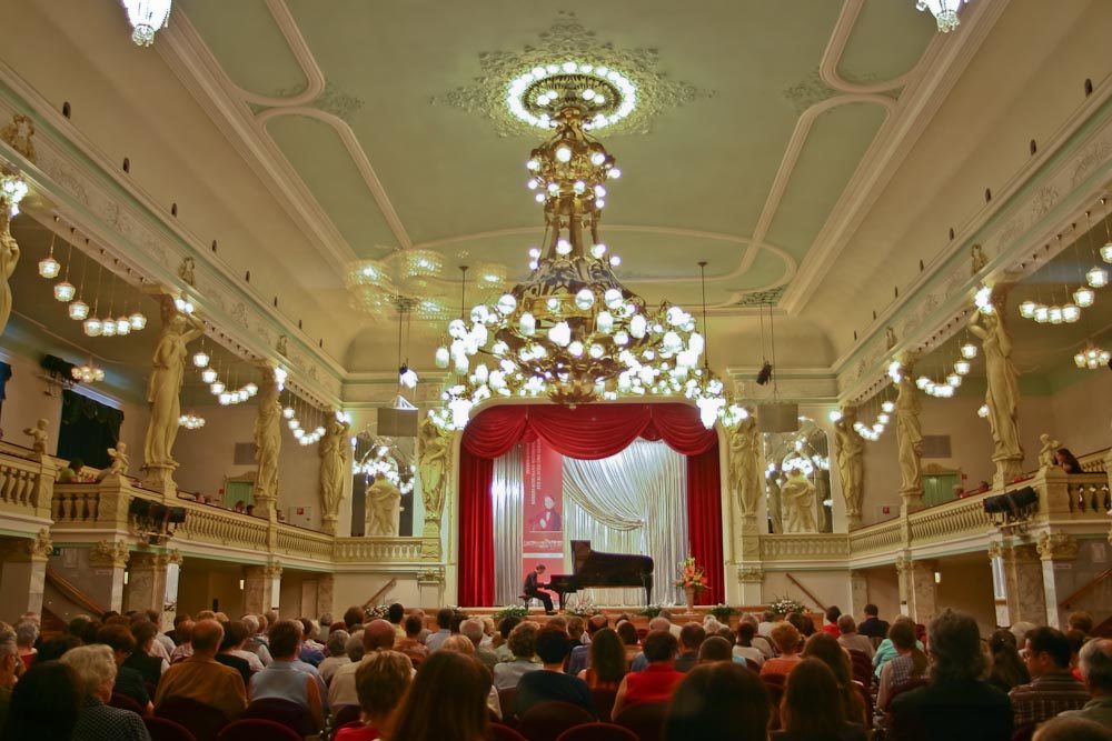 Friezes, ornaments, crystal mirrors and chandeliers complete the appearance. The concert and ball hall was built according to the plans of Johannes Henning and Emil Rascher and was ceremonially opened on 31 May 1903 with an extensive festive programme.