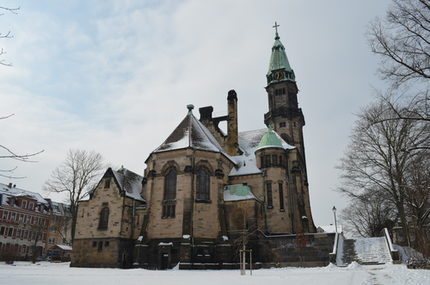 In 1894, the Lutheran parish decided to build a church in the present-day Bahnhofsvorstadt. The Dresden-based architects Schilling and Gräbner were commissioned with the project. The Art Nouveau structure, which went up between 1902 and 1906, cost 600,000 marks. The hall church is a brick building with an unusual floor plan, and is faced entirely with sandstone.