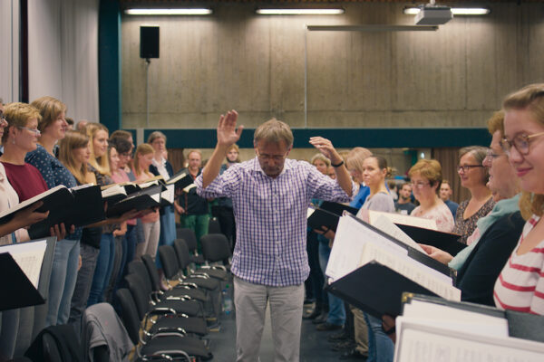 der Chor der Pauluskirche Zwickau gemeinsam das Kinopublikum zum Singen..
