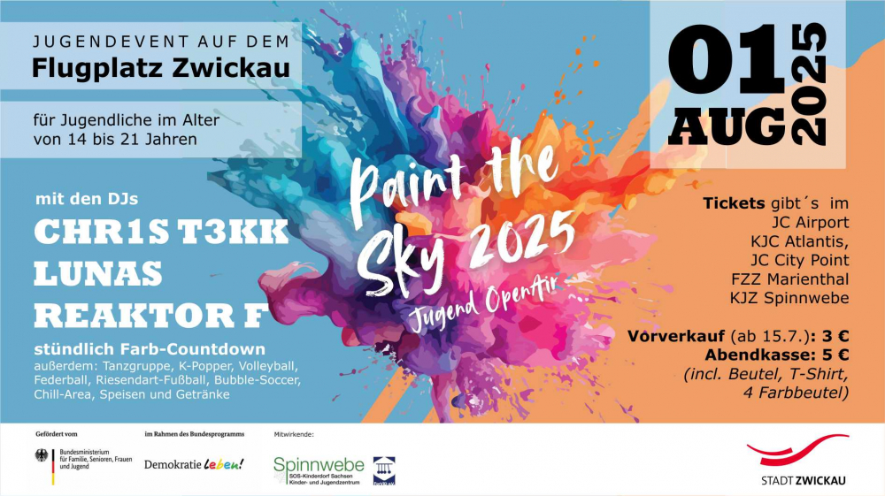 Am Freitagnachmittag, 1. August 2025, 16 bis 20 Uhr verwandelt sich der Flugplatz Zwickau an der Reichenbacher Straße in eine open-Air-Area. Eine Bühne, 3 DJs, ein Mix an trendigen Freizeitofferten, einigen Darbietungen und jede Menge angesagte Mucke - all das vereint das Jugendevent „Paint the Sky".