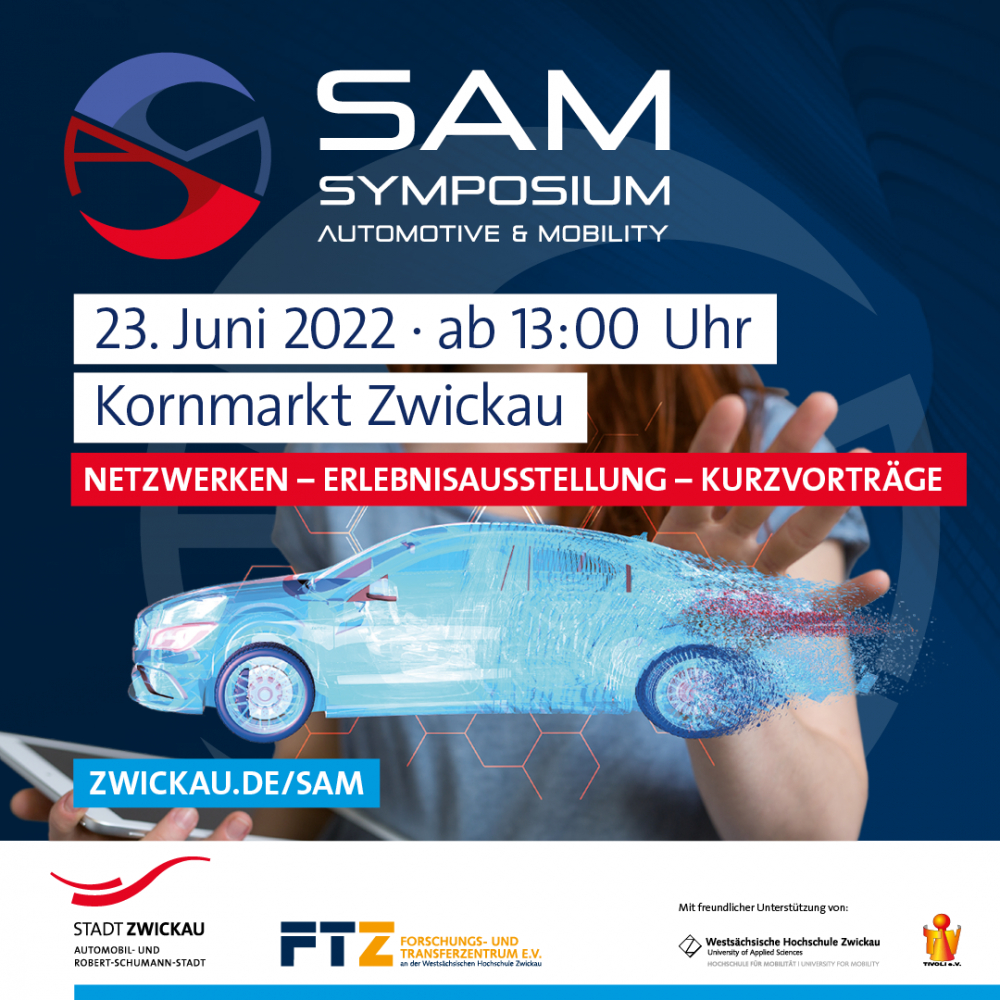 Netzwerken, Erlebnisausstellung, Unternehmenskontakte und Impulsvorträge für Studierende, Unternehmen und Forschung – das zeichnet das Symposium „Automotive & Mobility“ (SAM) aus. Die Veranstaltung vernetzt die zukünftigen Fachkräfte der Automobilbranche mit regionalen Unternehmen und Forschungseinrichtungen. Das inzwischen fünfte SAM findet am Donnerstag, dem 23. Juni statt. Den Rahmen für intensives Netzwerken bietet ab 13 Uhr die Erlebnisausstellung auf dem Zwickauer Kornmarkt, bei der Unternehmen ihre Mobilitätskonzepte und innovativen Lösungen vorstellen. Mit dabei sind unter anderem AKKA EMC, EDAG Engineering, FES, Fraunhofer AZOM, das HZwo Innovationscluster, Modis, Pendix, das WHZ Racing Team und Volkswagen.