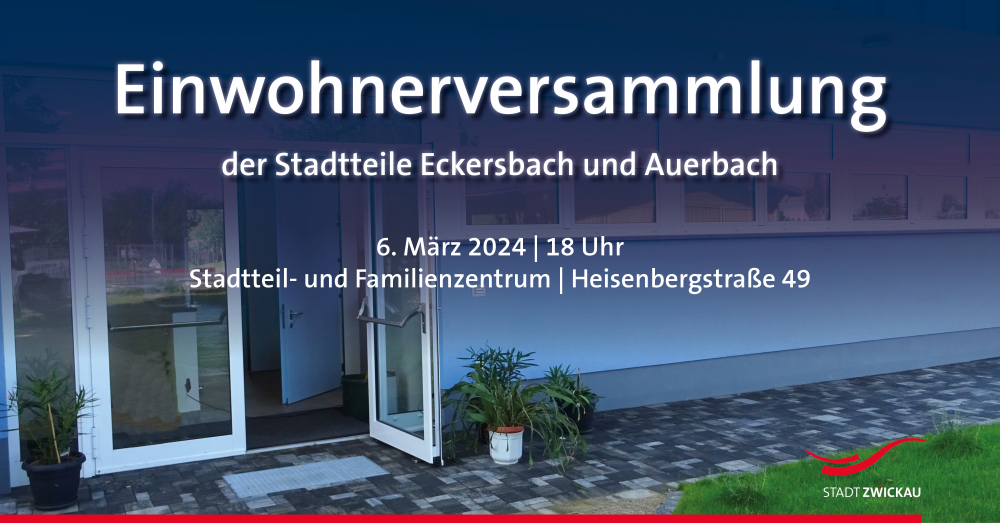 Oberbürgermeisterin Constance Arndt lädt zu einer Einwohnerversammlung für die Stadtteile Eckersbach und Auerbach ein. Diese findet am Mittwoch, dem 6. März, um 18 Uhr im Stadtteil- und Familienzentrum in der Heisenbergstraße 49 (blauer Anbau am Kinderhaus „Kuschelkiste") statt.